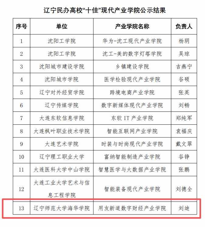 根据辽宁省民办教育协会《关于开展辽宁民办高校“十佳”现代产业学院评选活动的通知》要求,经各民办高校推荐、申报,经辽宁省民办教育协会专家委员会评审,拟确定13家产业学院为辽宁民办高校“十佳”现代产业学院。我校刘迪教授负责的“用友新道数字财经产业学院”位列其中。我校将以此为契机,深化产业学院建设,提升应用型人才培养质量,推动科研成果转化,增强服务地方社会经济发展水平,提升学校社会影响力。