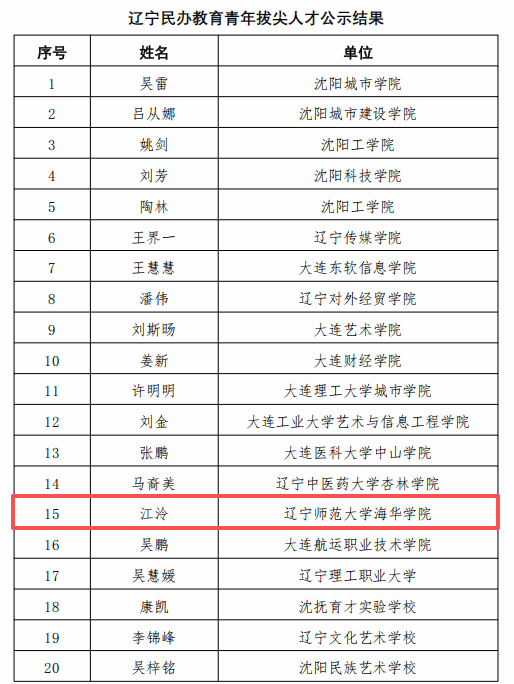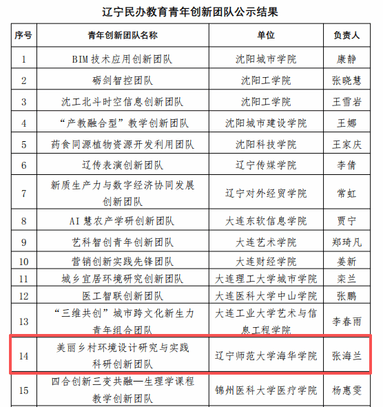 近日,根据辽宁省民办教育协会《关于辽宁民办教育青年创新团队和青年拔尖人才评选结果的公示》,我校由张海兰老师负责的“美丽乡村环境设计研究与实践科研创新团队”入选辽宁民办教育青年创新团队。我校江泠老师入选辽宁民办教育青年拔尖人才。