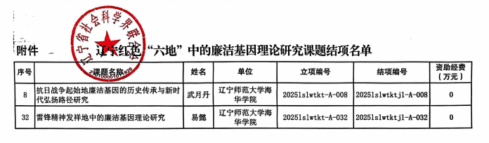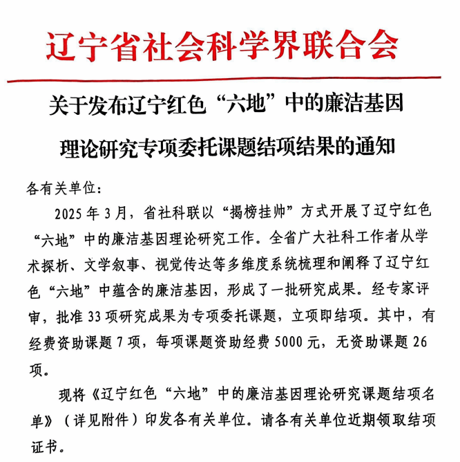 近日,根据《关于发布辽宁红色“六地”中的廉洁基因理论研究专项委托课题结项结果的通知》,我校2项课题获批“辽宁红色‘六地’中廉洁基因理论研究专项委托课题”立项。该项目由辽宁省社会科学界联合会下发立项通知,立项即结项。