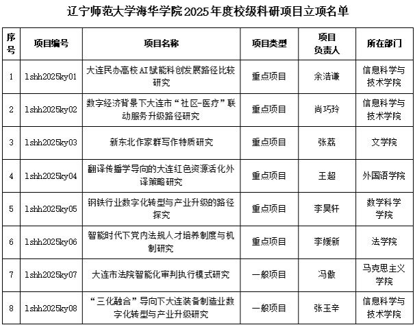 根据《辽宁师范大学海华学院关于开展2025年度校级科研项目申报工作的通知》(科字〔2025〕25号)文件要求,我校开展了校级科研项目立项工作。经专家评审,2025年校级科研立项项目35项,其中重点项目6项、一般项目29项,现对立项项目提出如下要求: